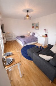 Espace de travail : Un bureau dédié et la fibre très haut débit font de cet appartement un lieu parfait pour le télétravail ou les séjours d’affaires.